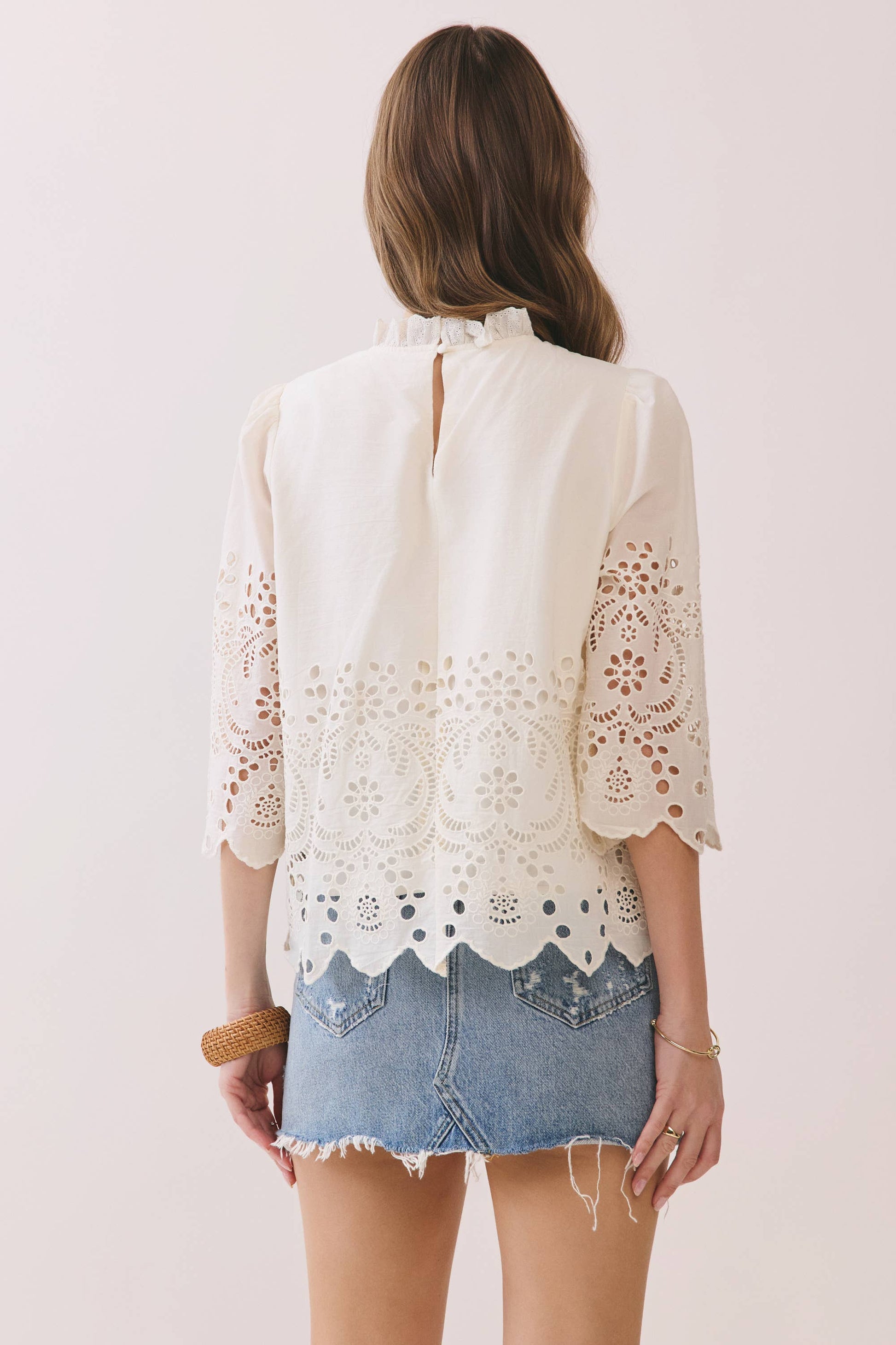 Embrace timeless elegance with this exquisite floral eyelet embroidery top. Featuring intricate eyelet detailing throughout the bodice and sleeves, this sophisticated blouse combines romantic charm with effortless style.