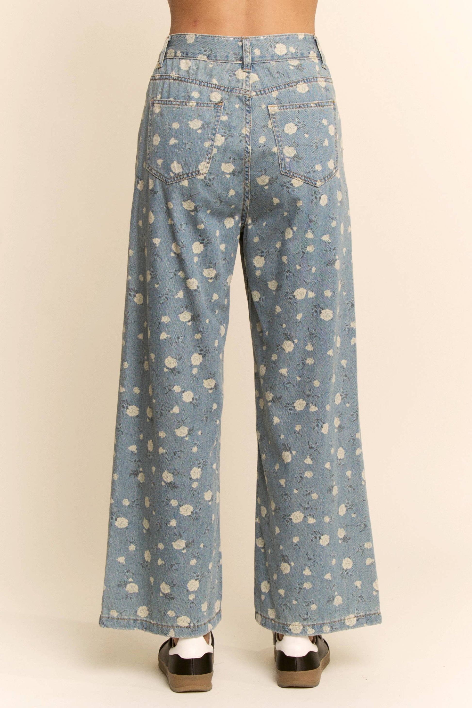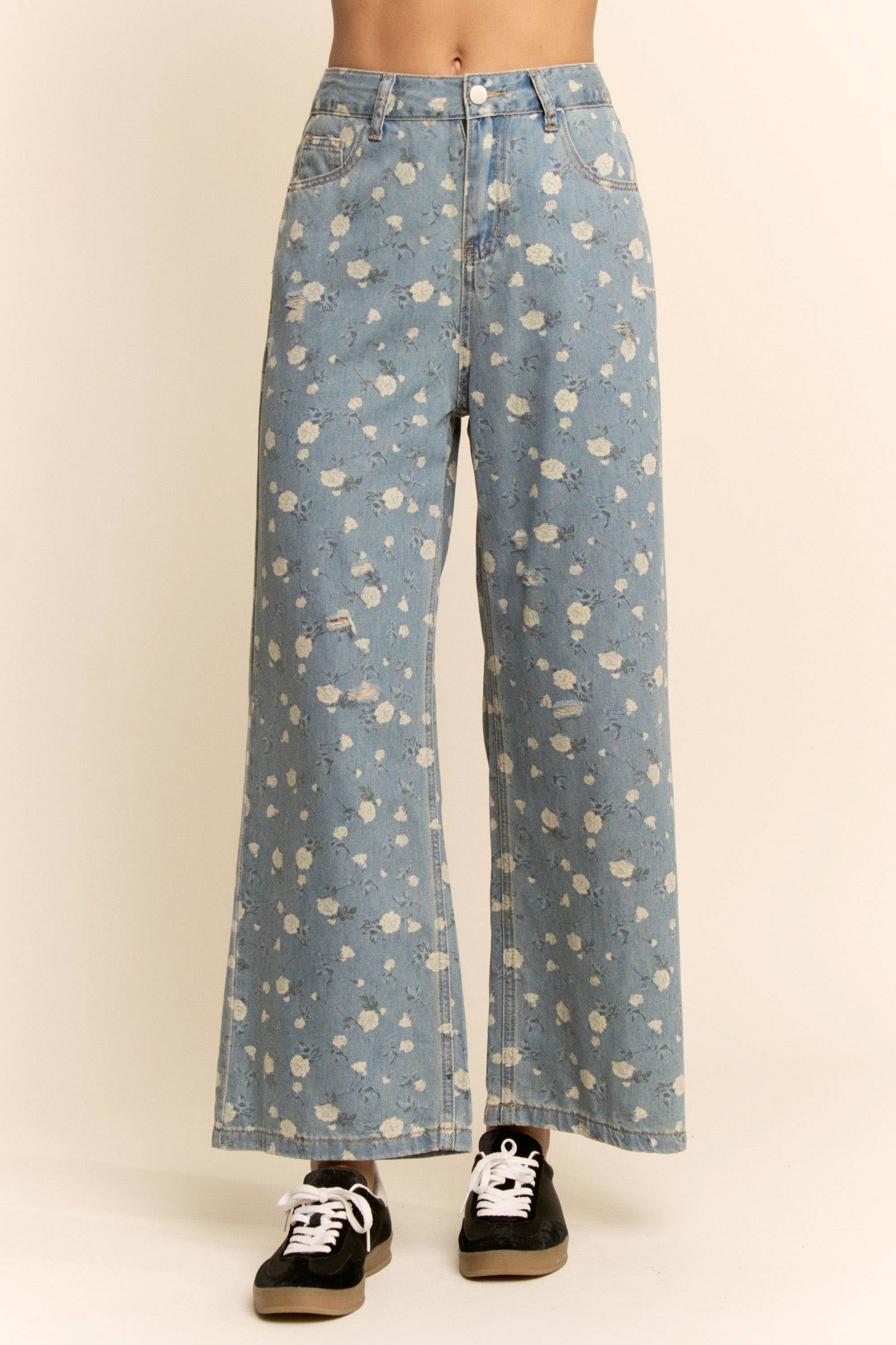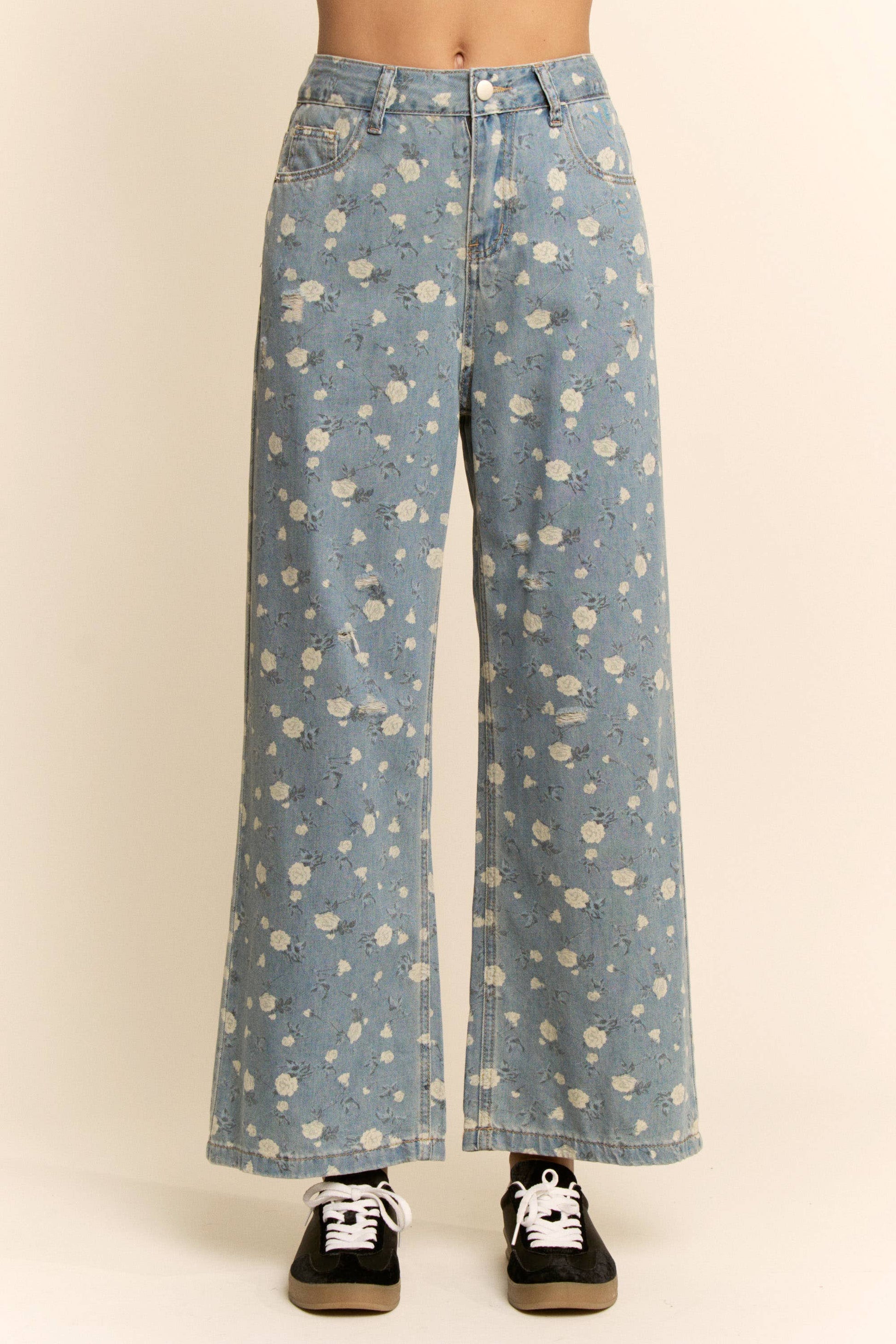 Wide leg denim pants featuring a soft floral print for a feminine, vintage inspired touch. Designed with a relaxed silhouette, classic five pocket styling, and gentle distressed accents for added character. Easy to pair with ruffle blouses, knits, or casual tees for a versatile look that transitions effortlessly between everyday wear and boutique styled outfits.