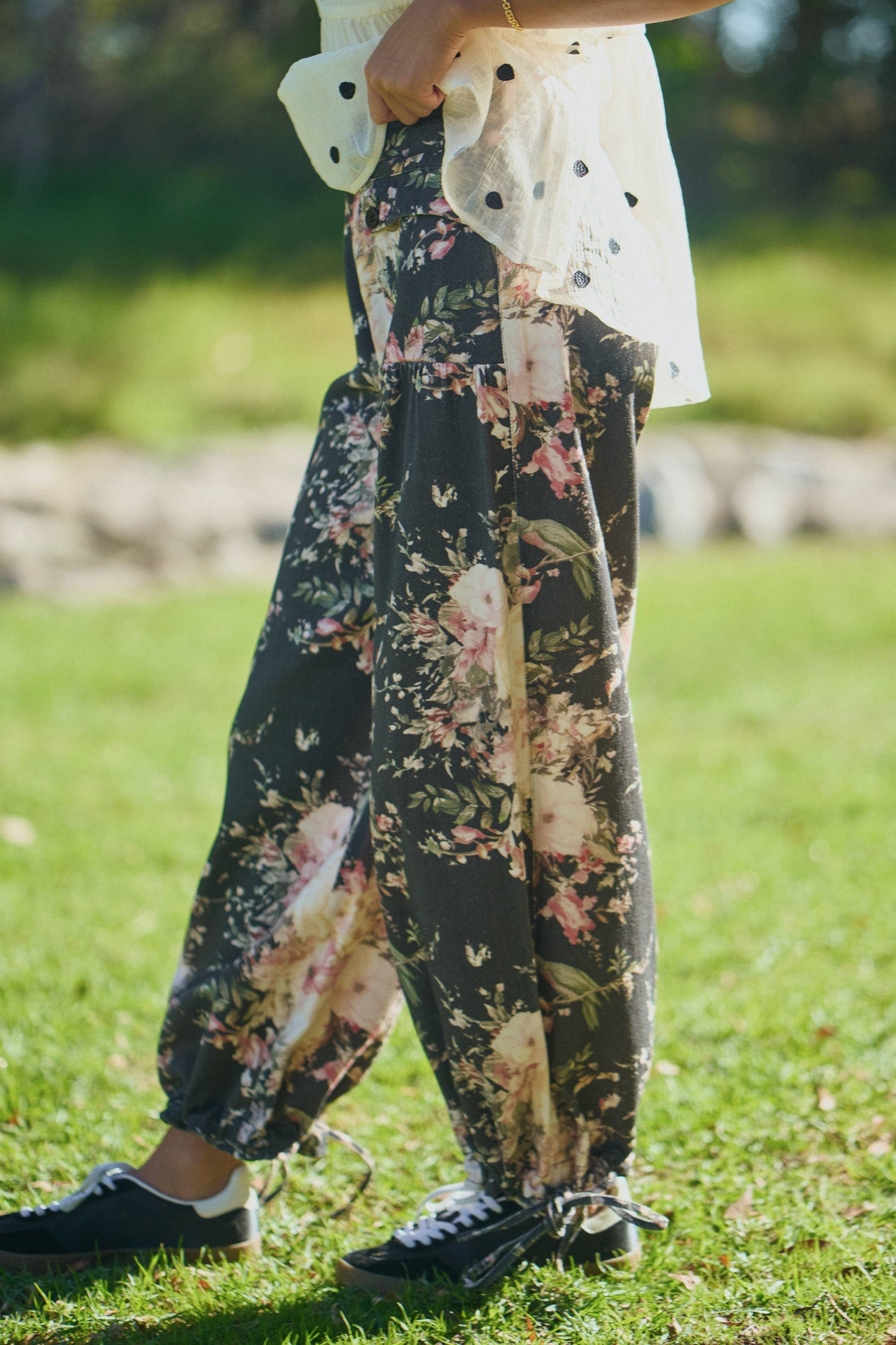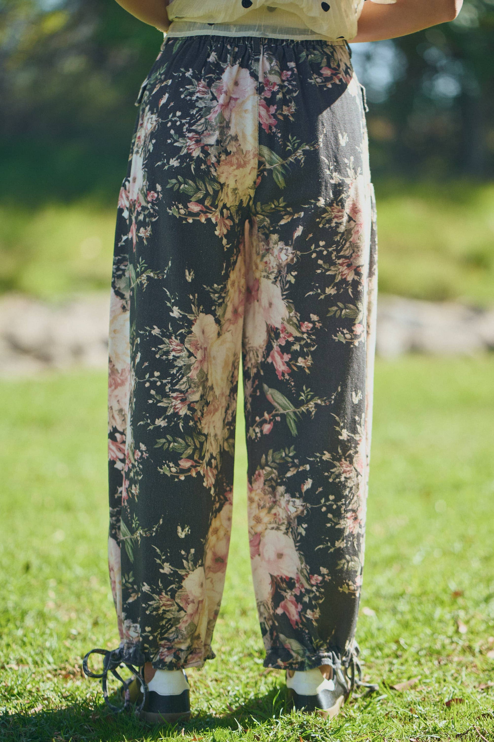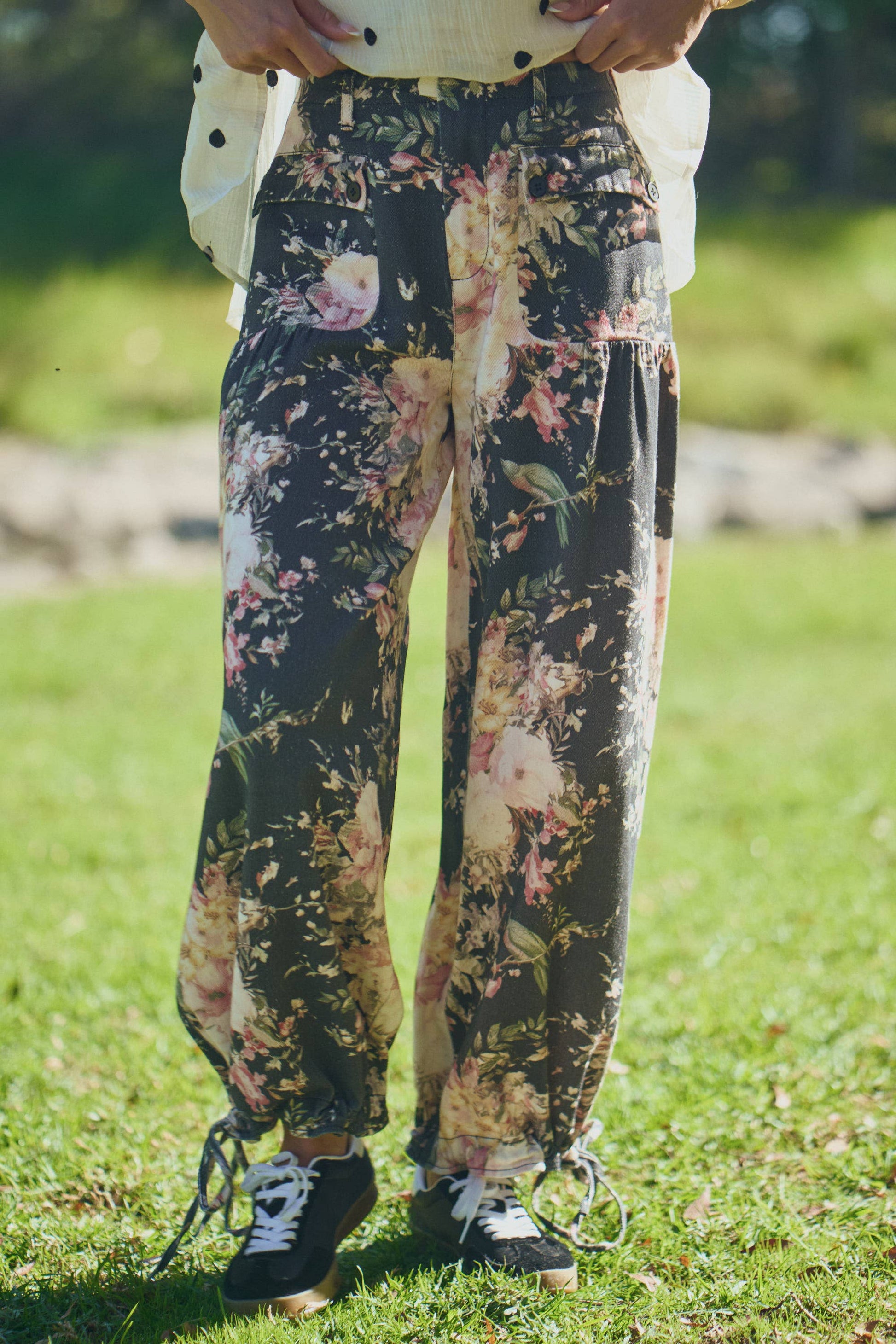A statement denim pant with a soft floral print and an easy wide leg that delivers relaxed structure with feminine detail. Designed with utility inspired flap pockets, a mid high waist, and adjustable hem ties for a custom finish. A boutique ready style that blends casual comfort with elevated pattern, perfect for pairing with knits, woven tops, and lightweight layers across seasons.