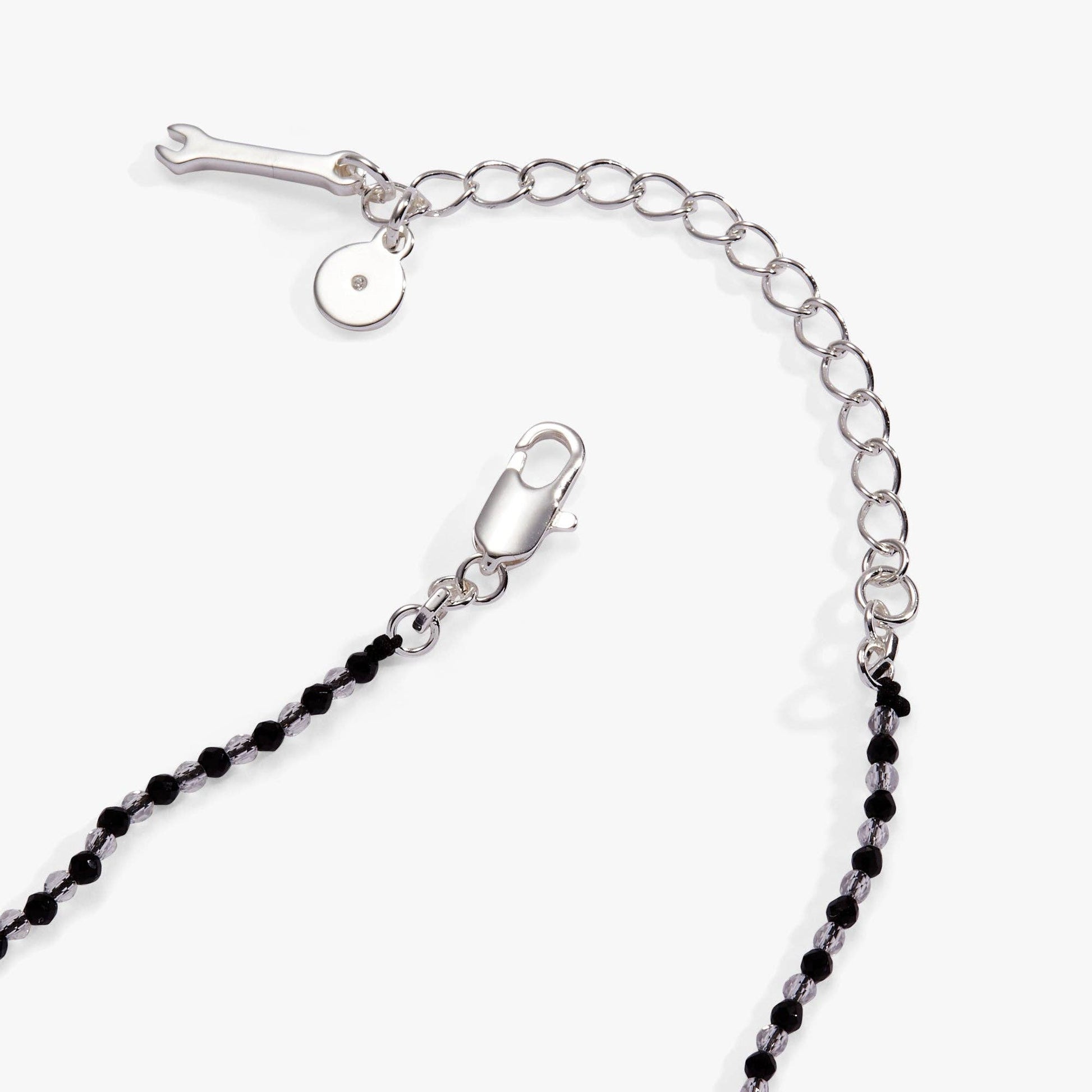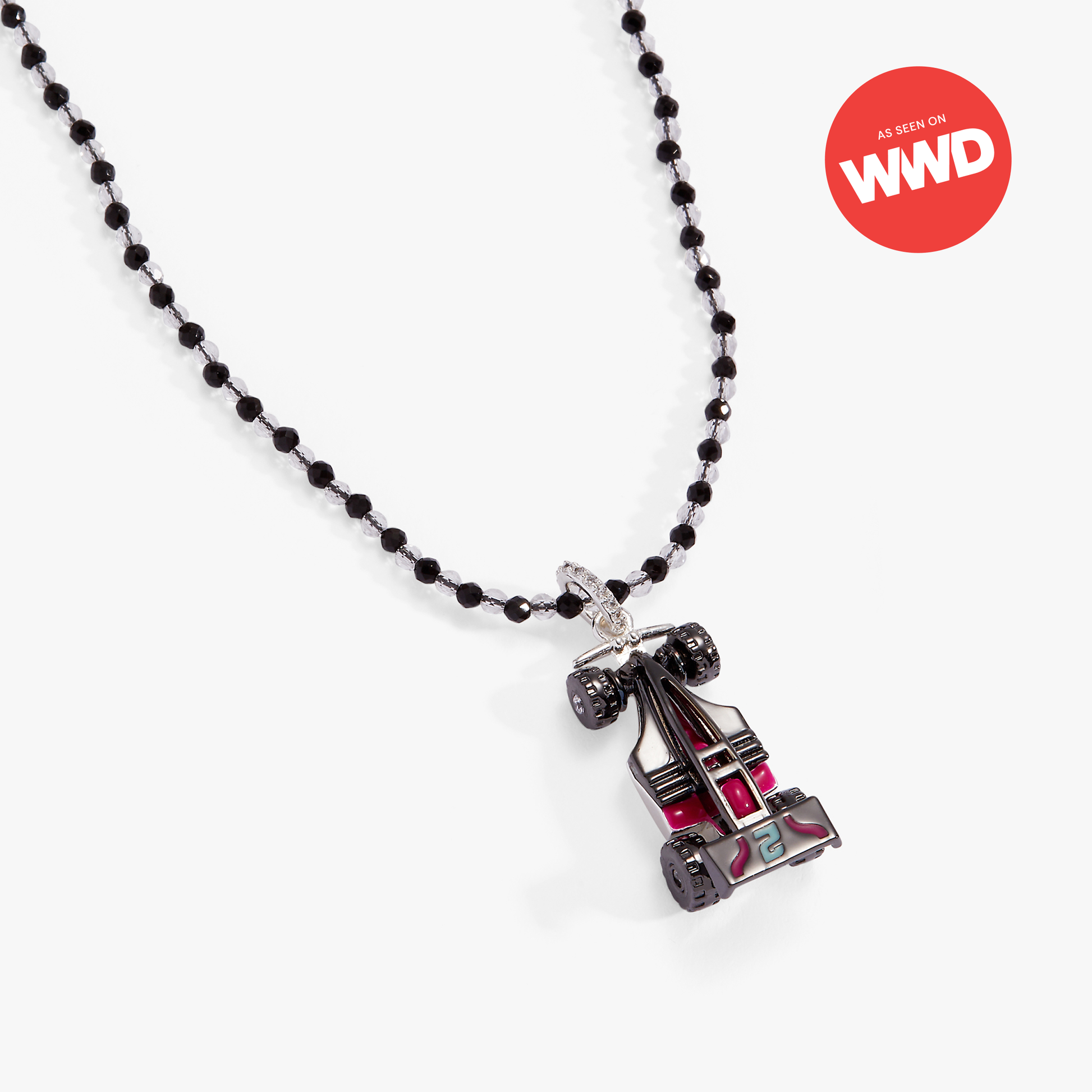 Made to stand out with every detail, the Hot Wheels™ x Alex and Ani Car Pendant Necklace features a 3D enamel racecar with crystal-accented spinning wheels and a tiny driver inside. Strung on a black and white beaded chain with hexbolt endcaps and a logo tag, it’s finished with polished touches and playful movement. A bold piece with serious curb appeal.