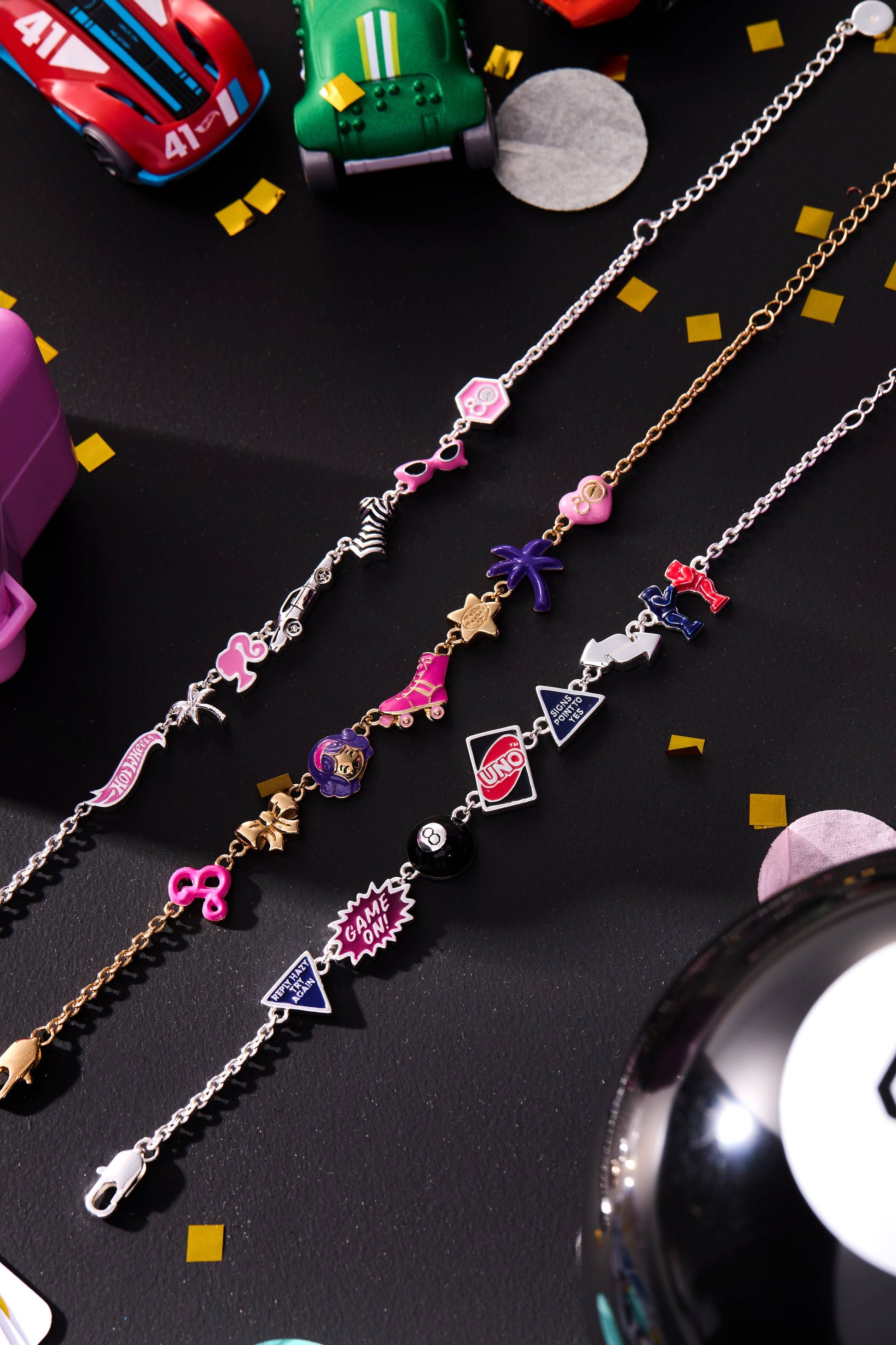 Celebrate nostalgia with the Mattel® 80th Barbie™ x Polly Pocket® Bracelet. This playful multi-charm linear bracelet features iconic 90's Barbie pink and purple enamel charms, including a roller skate, bow, retro Barbie "B," Polly Pocket star, heart, and doll face. Perfect for fans of all ages, it’s a fun, versatile way to show your love for these beloved Mattel icons. Wear it alone or layer with other Polly Pocket and Barbie styles for a colorful, nostalgic look.