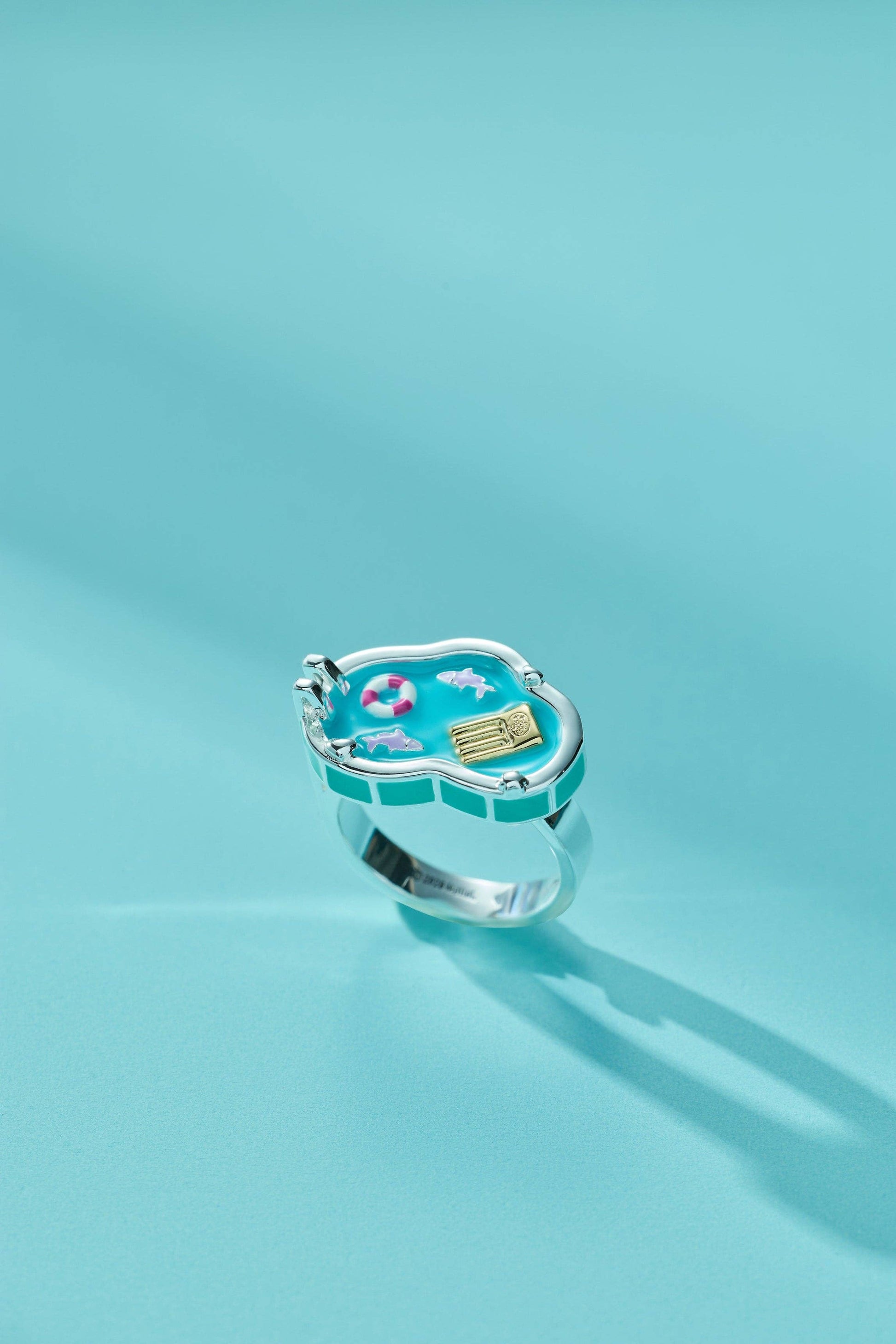 Dive into nostalgia with this enchanting limited edition pool party ring that captures the whimsy of Polly Pocket™ magic. Crafted with lustrous silver plating, this cocktail ring features a shimmering pool adorned with transparent enamel "water," a golden lounger float, delicate lavender fish, and a charming striped float. A miniature ladder climbs the ring's side, inviting you into this tiny aquatic wonderland, while striped enamel details frame the pool's edges. Perfect for those who cherish playful, nostalgic style, this versatile piece lets you celebrate poolside joy and beloved childhood memories with every wear.