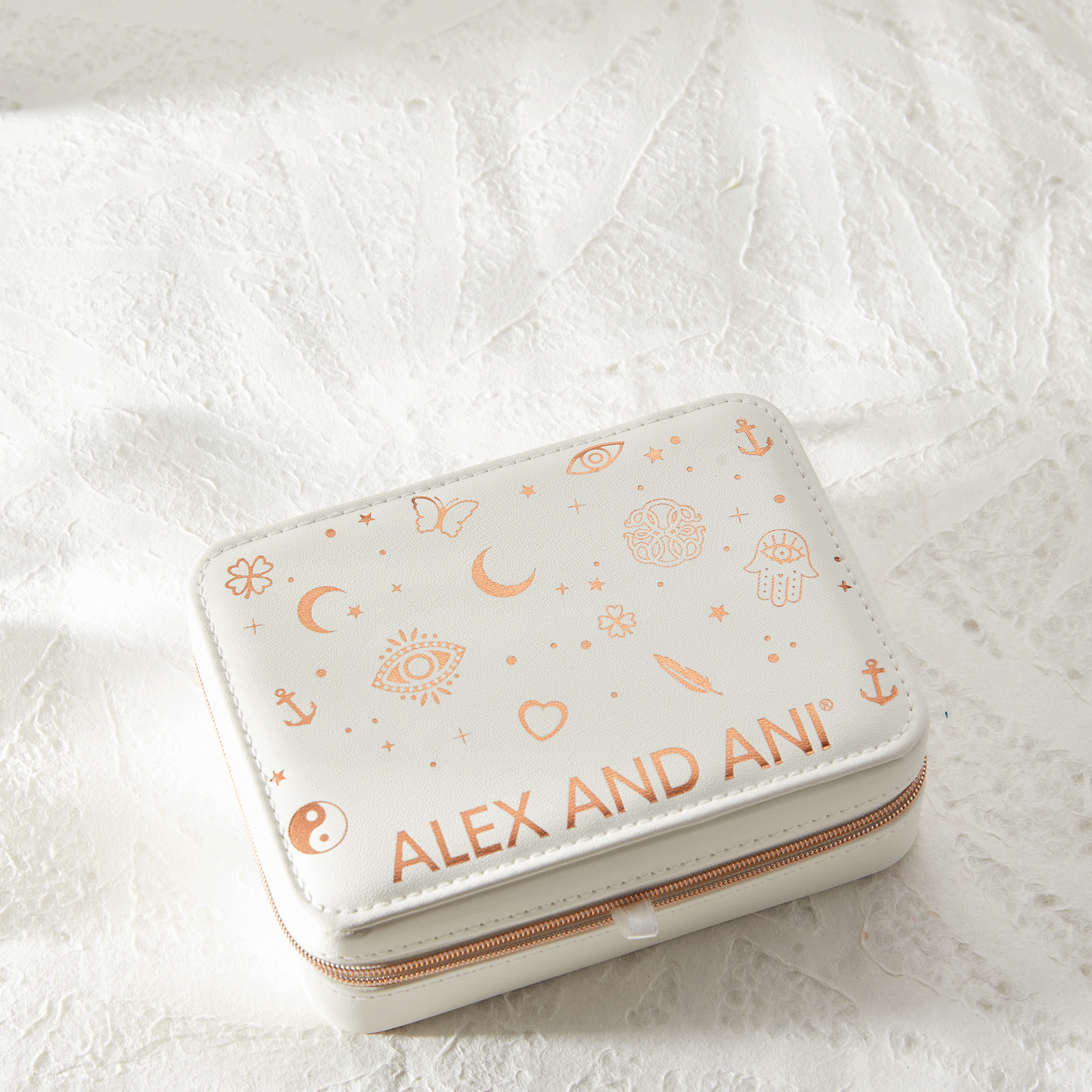 Protect your precious collection in style with the ALEX + ANI Symbols Jewelry Case. Designed with the brand's signature aesthetic, this elegant storage solution keeps your favorite pieces organized and secure while on the go or at home. The thoughtfully crafted case features protective compartments that safeguard delicate jewelry from damage, tangling, and scratches. Perfect for travel or everyday storage, it combines functionality with the refined editorial elegance that defines ALEX + ANI's design philosophy. Invest in a case as meaningful as the jewelry it holds.