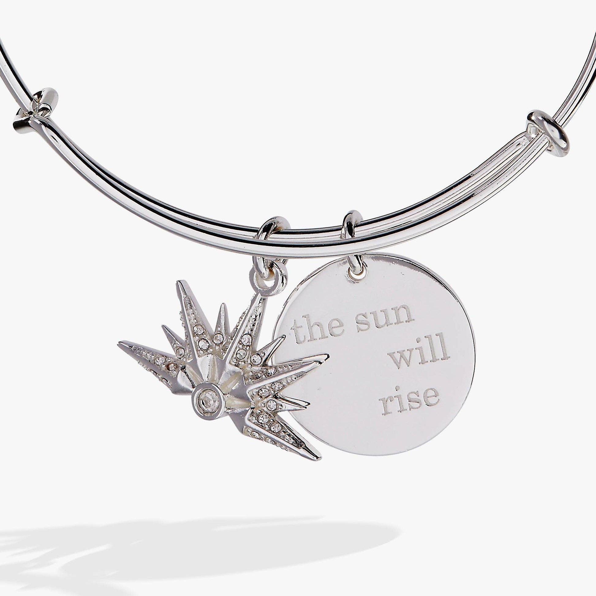 Just like every sunset leads to a sunrise, every ending leads to a new beginning. This “The Sun Will Rise” Duo Charm Bangle features two charms: a circular charm engraved with “The Sun Will Rise” and a sunrise charm accented with a sparkling clear crystal, both on an expandable wire bangle bracelet. Wear it — or gift it — as a reminder that tomorrow is waiting for you with all of its possibilities.